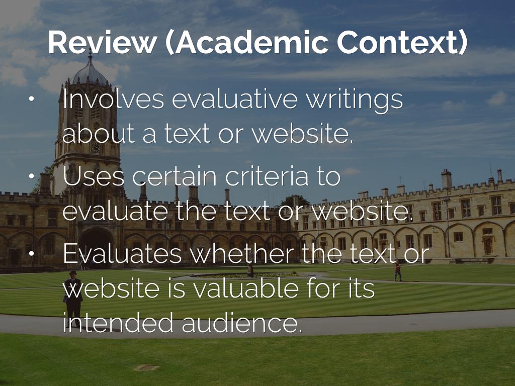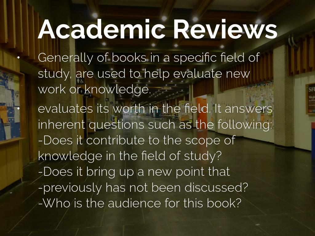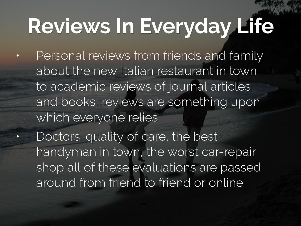 Personal reviews from friends and family about the new Italian restaurant in town to academic reviews of journal articles and books, reviews are something upon which everyone relies