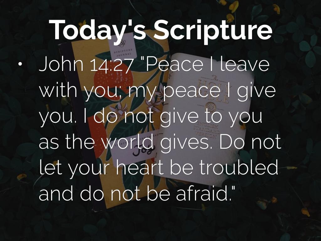 John 14:27 "Peace I leave with you; my peace I give you. I do not give to you as the world gives. Do not let your heart be troubled and do not be afraid."