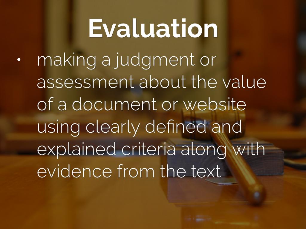 making a judgment or assessment about the value of a document or website using clearly defined and explained criteria along with evidence from the text