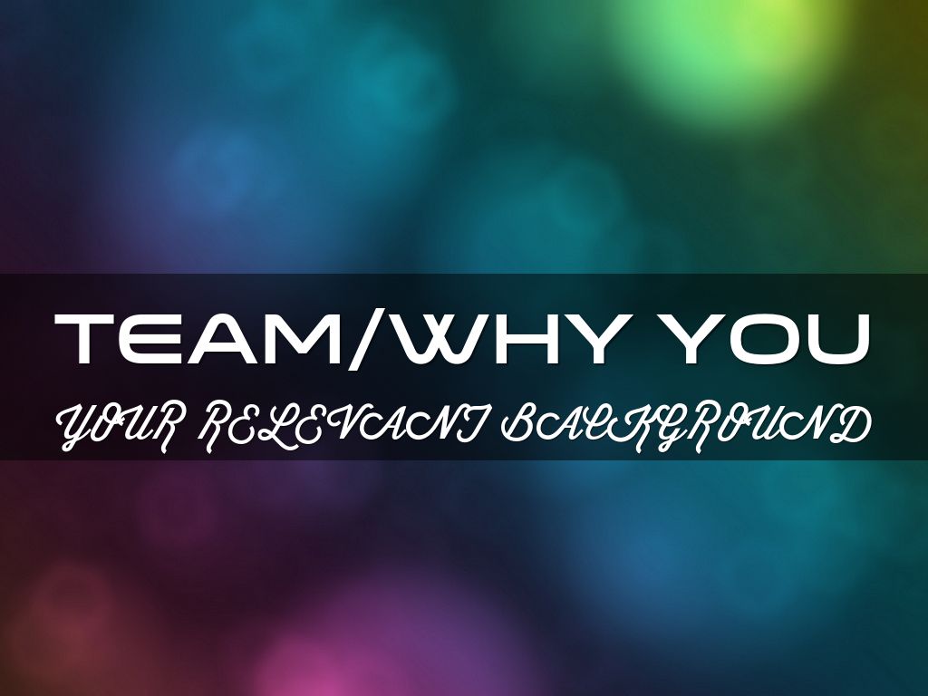 What have you done in the past that has prepared you to take on this new challenge? Why are you well-suited to succeed in this venture? How will others help you, and what relevant skills/experience will they bring to the project? How will you go about building your team from here and adding necessary expertise?