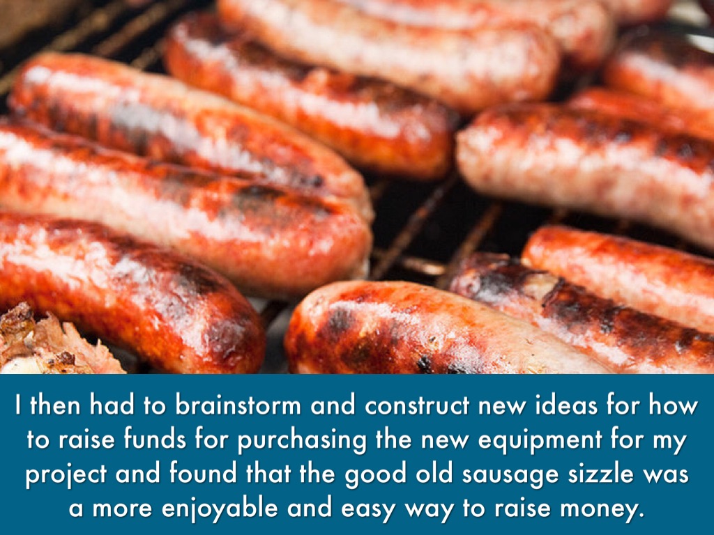 I then had to brainstorm and construct new ideas for how to raise funds for purchasing the new equipment for my project and found that the good old sausage sizzle was a more enjoyable and easy way to raise money.