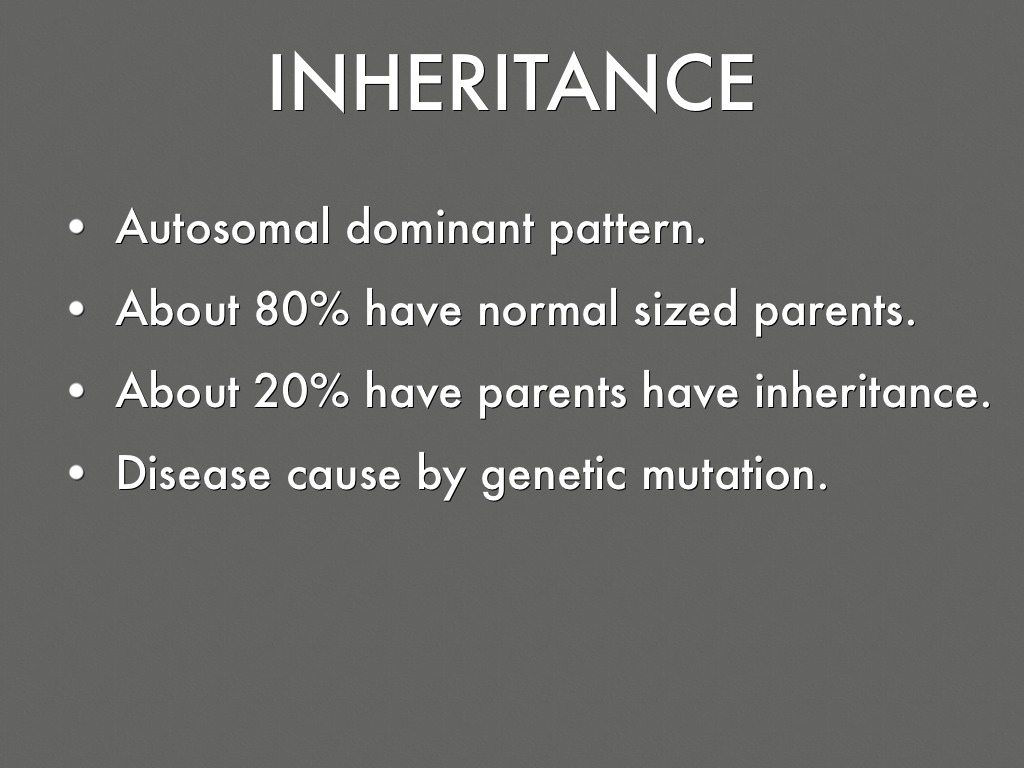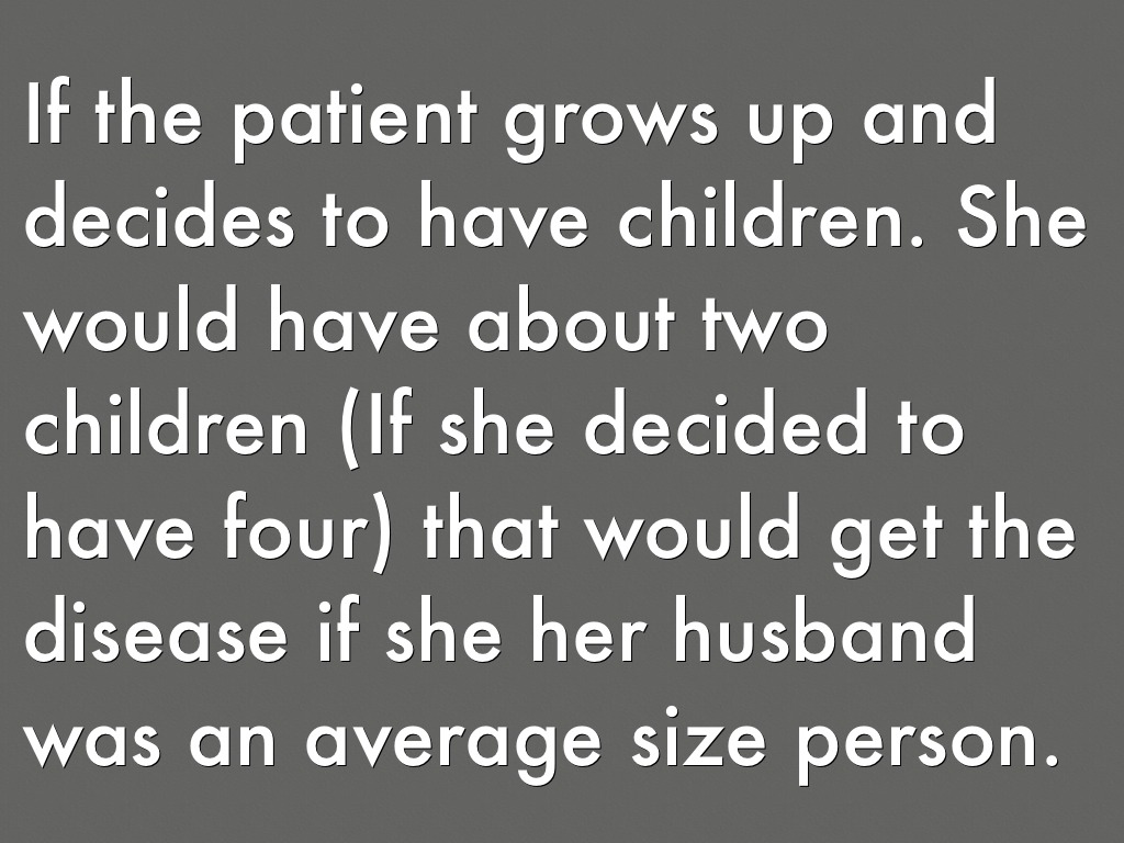 If the patient grows up and decides to have children. She would have about two children (If she decided to have four) that would get the disease if she her husband was an average size person.
