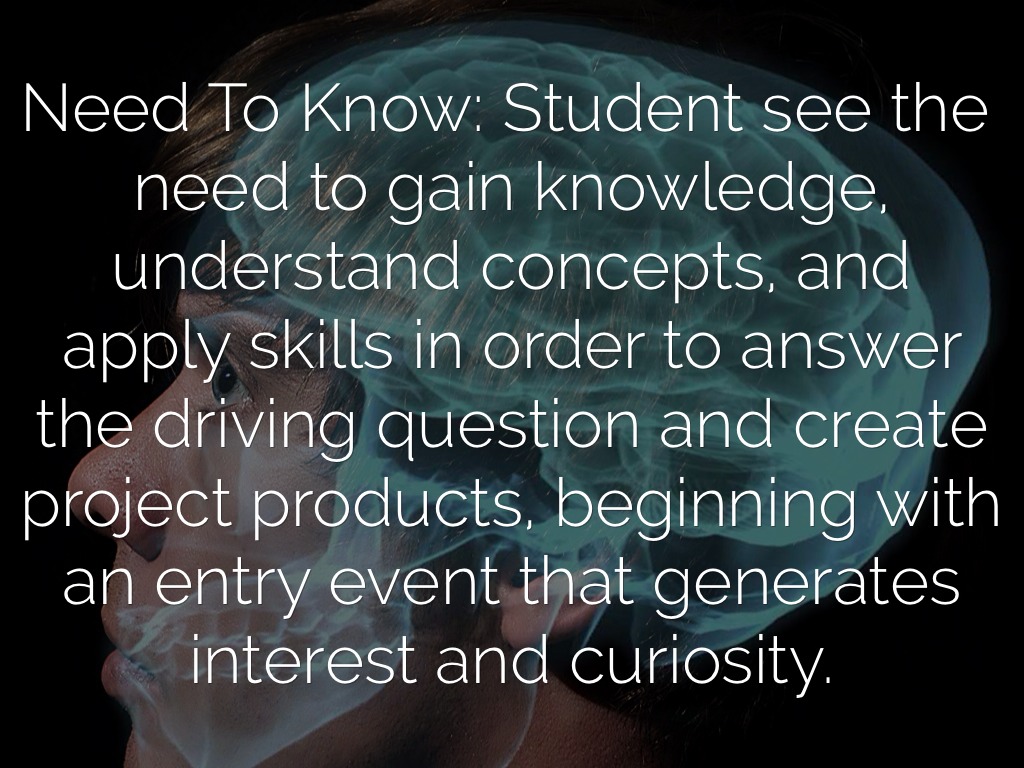 Need To Know: Student see the need to gain knowledge, understand concepts, and apply skills in order to answer the driving question and create project products, beginning with an entry event that generates interest and curiosity.