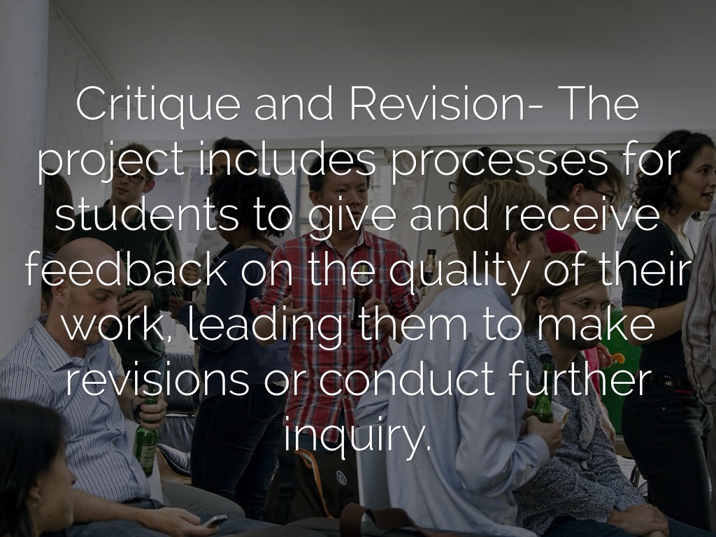 Critique and Revision- The project includes processes for students to give and receive feedback on the quality of their work, leading them to make revisions or conduct further inquiry.