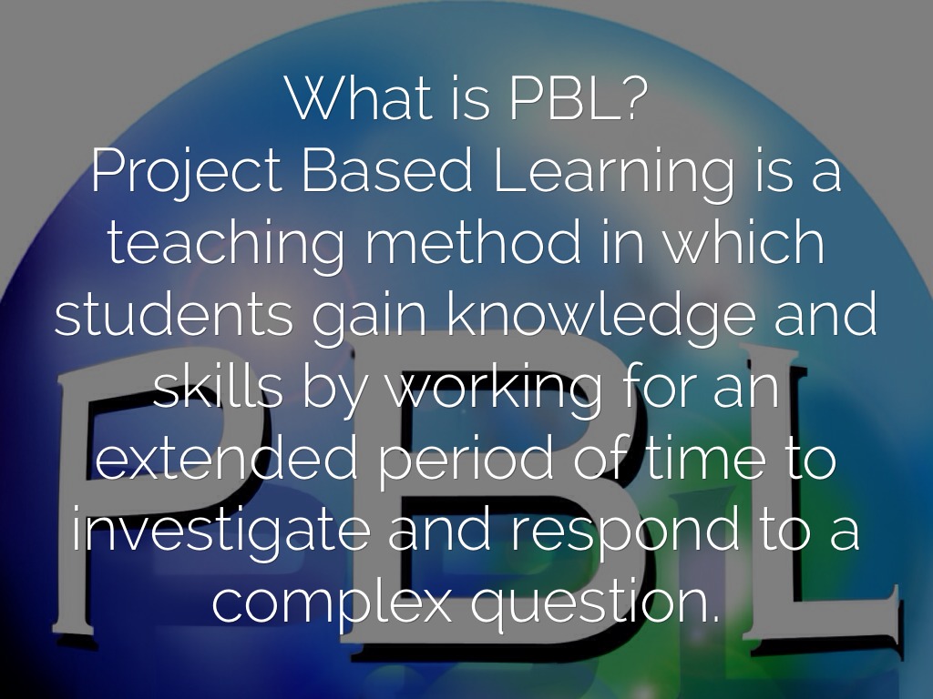 Project Based Learning is a teaching method in which students gain knowledge and skills by working for an extended period of time to investigate and respond to a complex question.