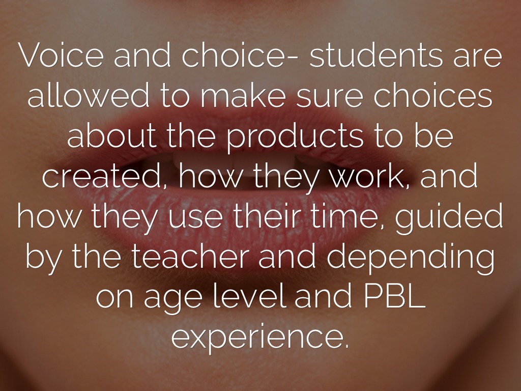 Voice and choice- students are allowed to make sure choices about the products to be created, how they work, and how they use their time, guided by the teacher and depending on age level and PBL experience.