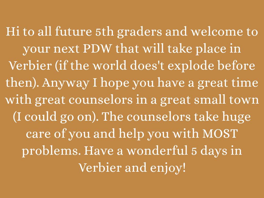 Hi to all future 5th graders and welcome to your next PDW that will take place in Verbier (if the world does't explode before then). Anyway I hope you have a great time with great counselors in a great small town (I could go on). The counselors take huge care of you and help you with MOST problems. Have a wonderful 5 days in Verbier and enjoy!