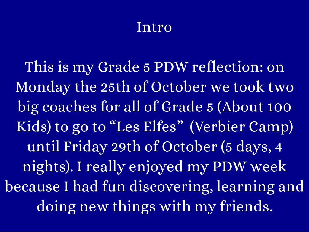 This is my Grade 5 PDW reflection: on Monday the 25th of October we took two big coaches for all of Grade 5 (About 100 Kids) to go to “Les Elfes” (Verbier Camp) until Friday 29th of October (5 days, 4 nights). I really enjoyed my PDW week because I had fun discovering, learning and doing new things with my friends.