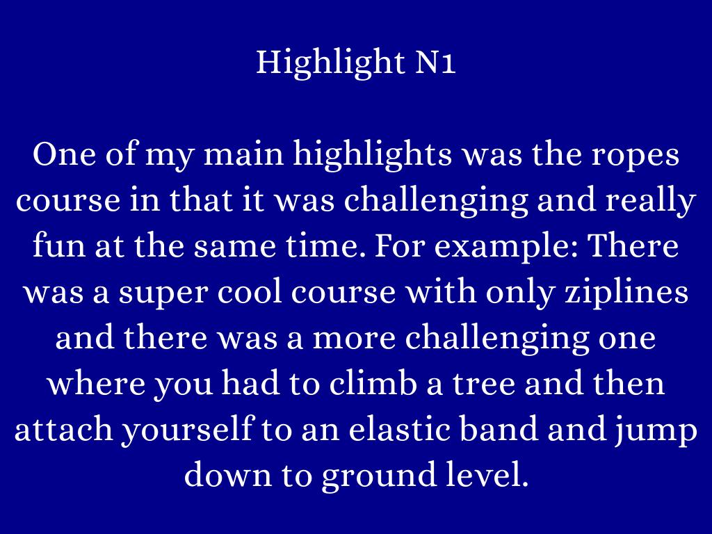 One of my main highlights was the ropes course in that it was challenging and really fun at the same time. For example: There was a super cool course with only ziplines and there was a more challenging one where you had to climb a tree and then attach yourself to an elastic band and jump down to ground level.