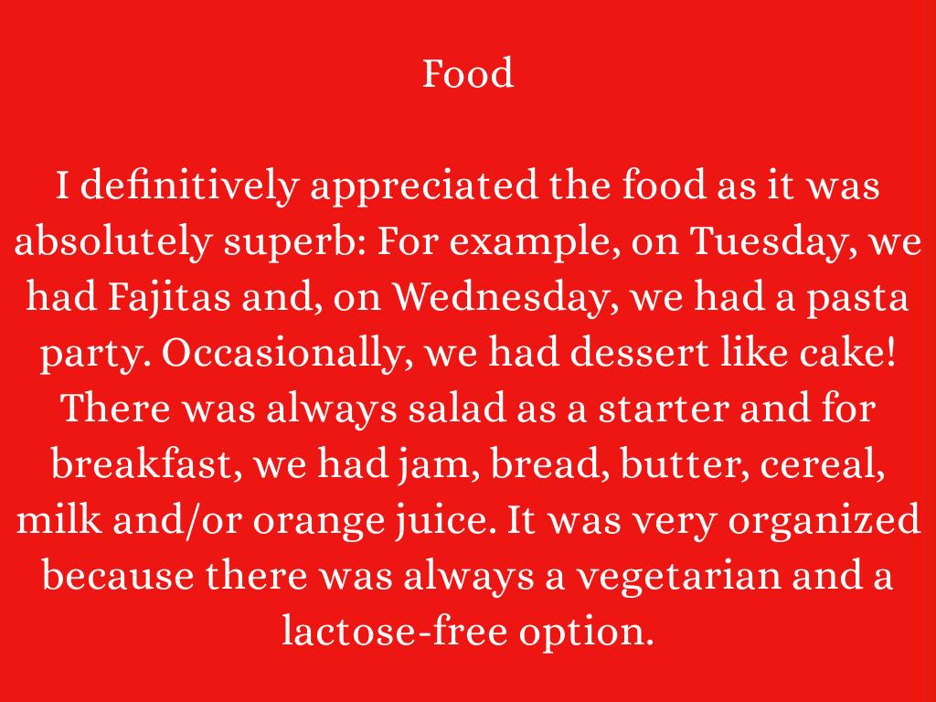 I definitively appreciated the food as it was absolutely superb: For example, on Tuesday, we had Fajitas and, on Wednesday, we had a pasta party. Occasionally, we had dessert like cake! There was always salad as a starter and for breakfast, we had jam, bread, butter, cereal, milk and/or orange juice. It was very organized because there was always a vegetarian and a lactose-free option.