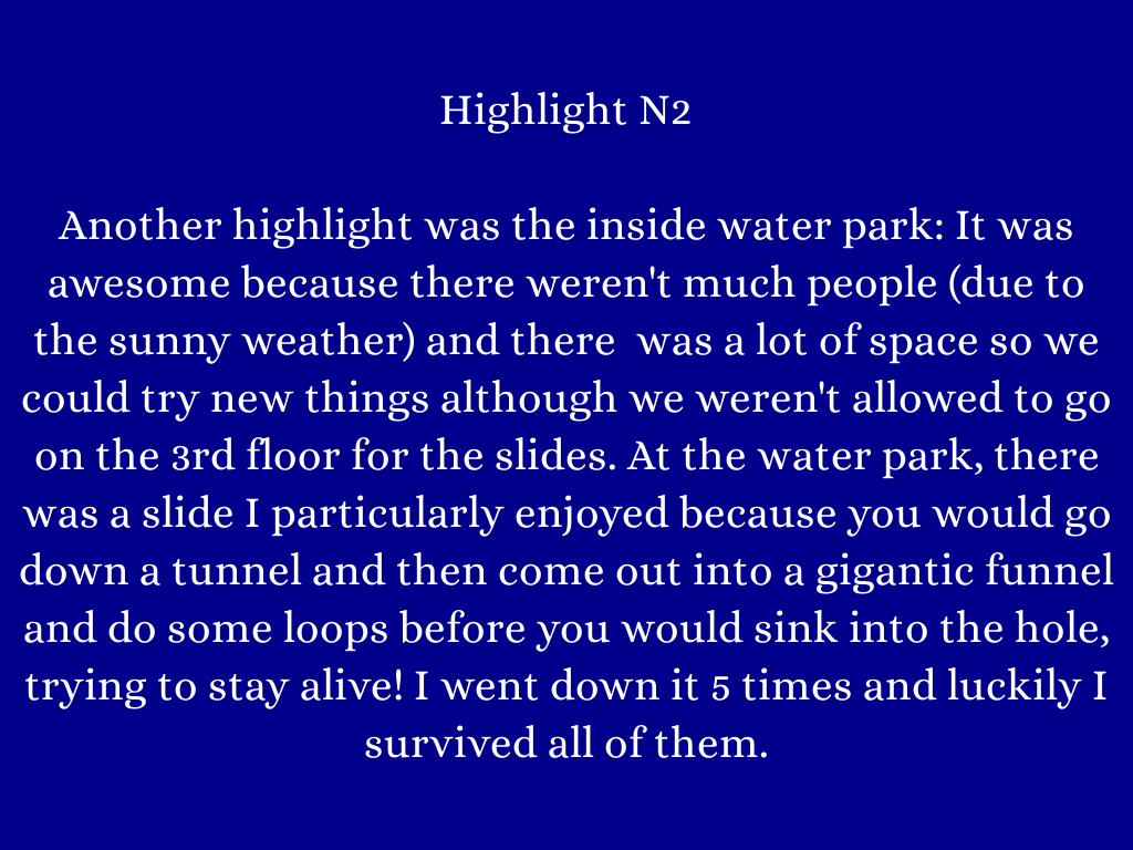 Another highlight was the inside water park: It was awesome because there weren't much people (due to the sunny weather) and there was a lot of space so we could try new things although we weren't allowed to go on the 3rd floor for the slides. At the water park, there was a slide I particularly enjoyed because you would go down a tunnel and then come out into a gigantic funnel and do some loops before you would sink into the hole, trying to stay alive! I went down it 5 times and luckily I survived all of them.
