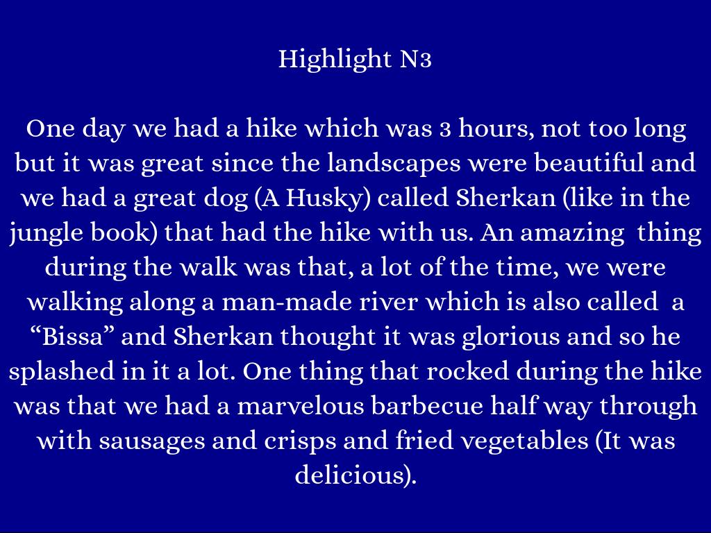 One day we had a hike which was 3 hours, not too long but it was great since the landscapes were beautiful and we had a great dog (A Husky) called Sherkan (like in the jungle book) that had the hike with us. An amazing thing during the walk was that, a lot of the time, we were walking along a man-made river which is also called a “Bissa” and Sherkan thought it was glorious and so he splashed in it a lot. One thing that rocked during the hike was that we had a marvelous barbecue half way through with sausages and crisps and fried vegetables (It was delicious).