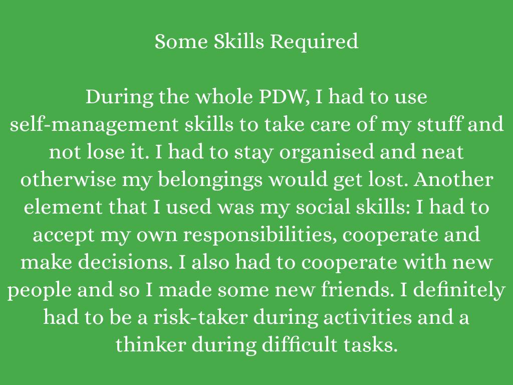 During the whole PDW, I had to use self-management skills to take care of my stuff and not lose it. I had to stay organised and neat otherwise my belongings would get lost. Another element that I used was my social skills: I had to accept my own responsibilities, cooperate and make decisions. I also had to cooperate with new people and so I made some new friends. I definitely had to be a risk-taker during activities and a thinker during difficult tasks.