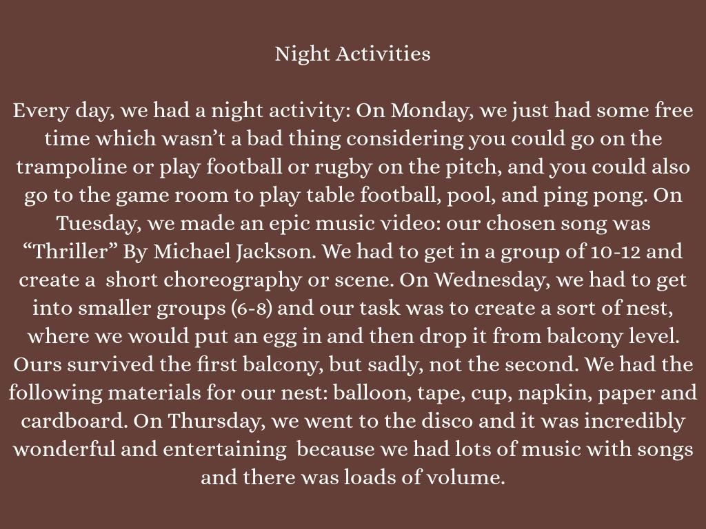 Every day, we had a night activity: On Monday, we just had some free time which wasn’t a bad thing considering you could go on the trampoline or play football or rugby on the pitch, and you could also go to the game room to play table football, pool, and ping pong. On Tuesday, we made an epic music video: our chosen song was “Thriller” By Michael Jackson. We had to get in a group of 10-12 and create a short choreography or scene. On Wednesday, we had to get into smaller groups (6-8) and our task was to create a sort of nest, where we would put an egg in and then drop it from balcony level. Ours survived the first balcony, but sadly, not the second. We had the following materials for our nest: balloon, tape, cup, napkin, paper and cardboard. On Thursday, we went to the disco and it was incredibly wonderful and entertaining because we had lots of music with songs and there was loads of volume.