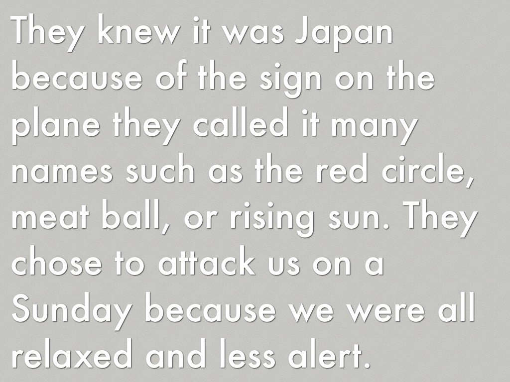 They knew it was Japan because of the sign on the plane they called it many names such as the red circle, meat ball, or rising sun. They chose to attack us on a Sunday because we were all relaxed and less alert.