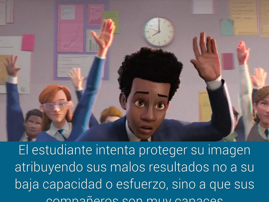 El estudiante intenta proteger su imagen atribuyendo sus malos resultados no a su baja capacidad o esfuerzo, sino a que sus compañeros son muy capaces académicamente. el estudiante realza las cualidades de sus compañeros, lo cual no tiene un sentimiento de admiración.