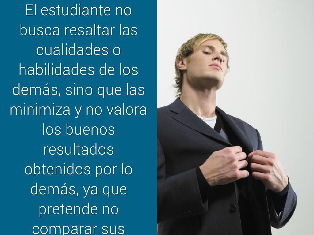El estudiante no busca resaltar las cualidades o habilidades de los demás, sino que las minimiza y no valora los buenos resultados obtenidos por lo demás, ya que pretende no comparar sus resultados y mantener una imagen competente de sí mismo