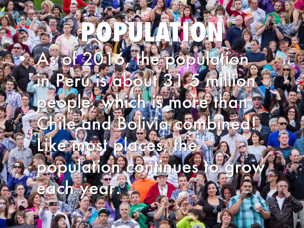 • As of 2016, the population in Perú is about 31.5 million people, which is more than Chile and Bolivia combined! Like most places, the population continues to grow each year.