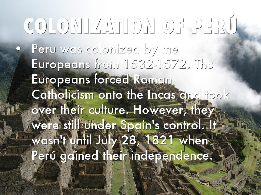 • Peru was colonized by the Europeans from 1532-1572. The Europeans forced Roman Catholicism onto the Incas and took over their culture. However, they were still under Spain's control. It wasn't until July 28, 1821 when Perú gained their independence.