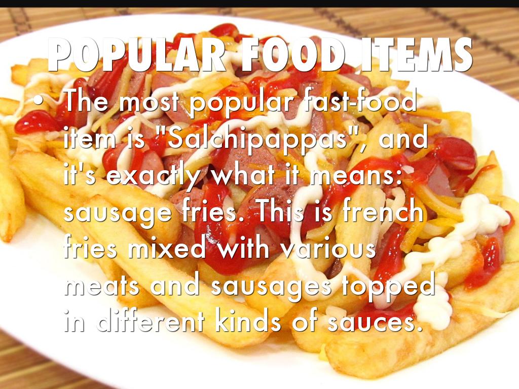 • The most popular fast-food item is "Salchipappas", and it's exactly what it means: sausage fries. This is french fries mixed with various meats and sausages topped in different kinds of sauces.
