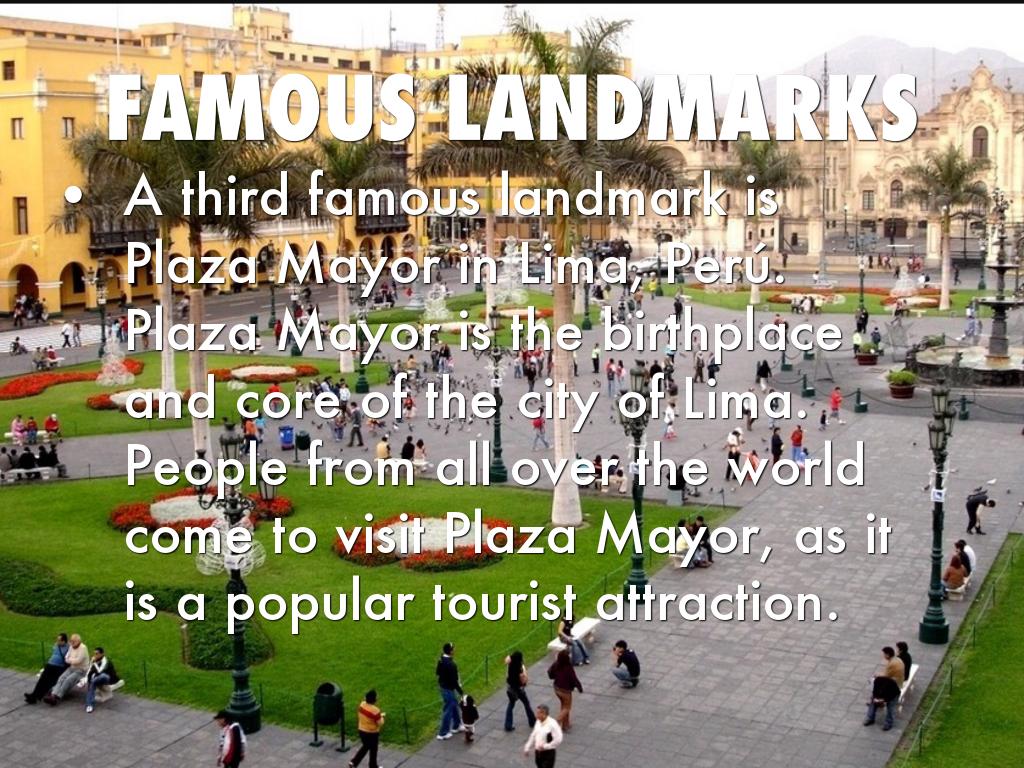 • A third famous landmark is Plaza Mayor in Lima, Perú. Plaza Mayor is the birthplace and core of the city of Lima. People from all over the world come to visit Plaza Mayor, as it is a popular tourist attraction.
