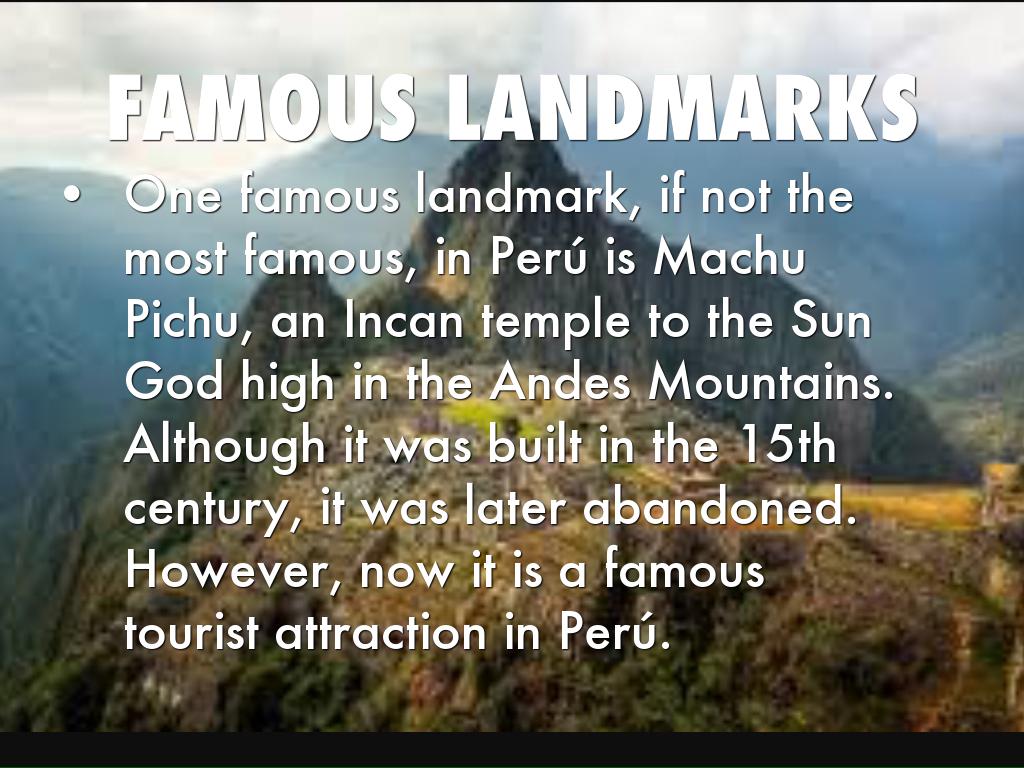 • One famous landmark, if not the most famous, in Perú is Machu Pichu, an Incan temple to the Sun God high in the Andes Mountains. Although it was built in the 15th century, it was later abandoned. However, now it is a famous tourist attraction in Perú.