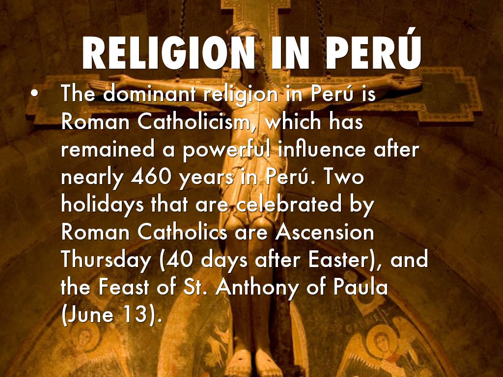 • The dominant religion in Perú is Roman Catholicism, which has remained a powerful influence after nearly 460 years in Perú. Two holidays that are celebrated by Roman Catholics are Ascension Thursday (40 days after Easter), and the Feast of St. Anthony of Paula (June 13).