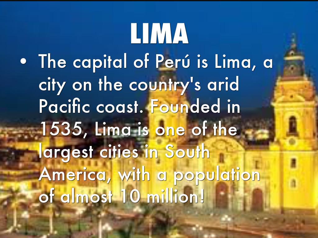 • The capital of Perú is Lima, a city on the country's arid Pacific coast. Founded in 1535, Lima is one of the largest cities in South America, with a population of almost 10 million!