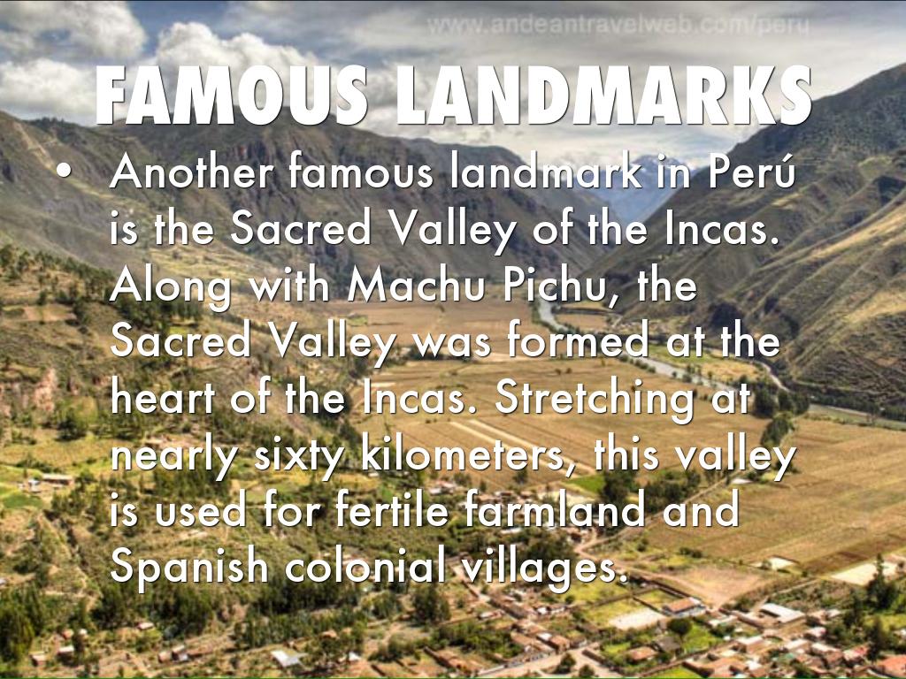 • Another famous landmark in Perú is the Sacred Valley of the Incas. Along with Machu Pichu, the Sacred Valley was formed at the heart of the Incas. Stretching at nearly sixty kilometers, this valley is used for fertile farmland and Spanish colonial villages.
