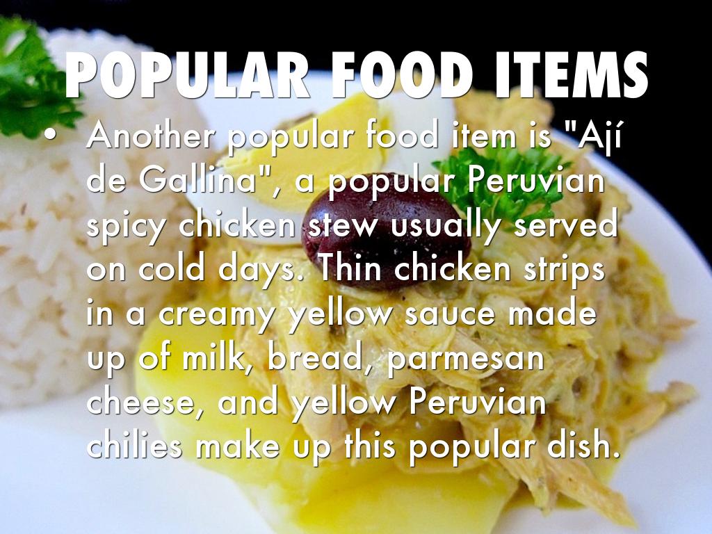 • Another popular food item is "Ají de Gallina", a popular Peruvian spicy chicken stew usually served on cold days. Thin chicken strips in a creamy yellow sauce made up of milk, bread, parmesan cheese, and yellow Peruvian chilies make up this popular dish.