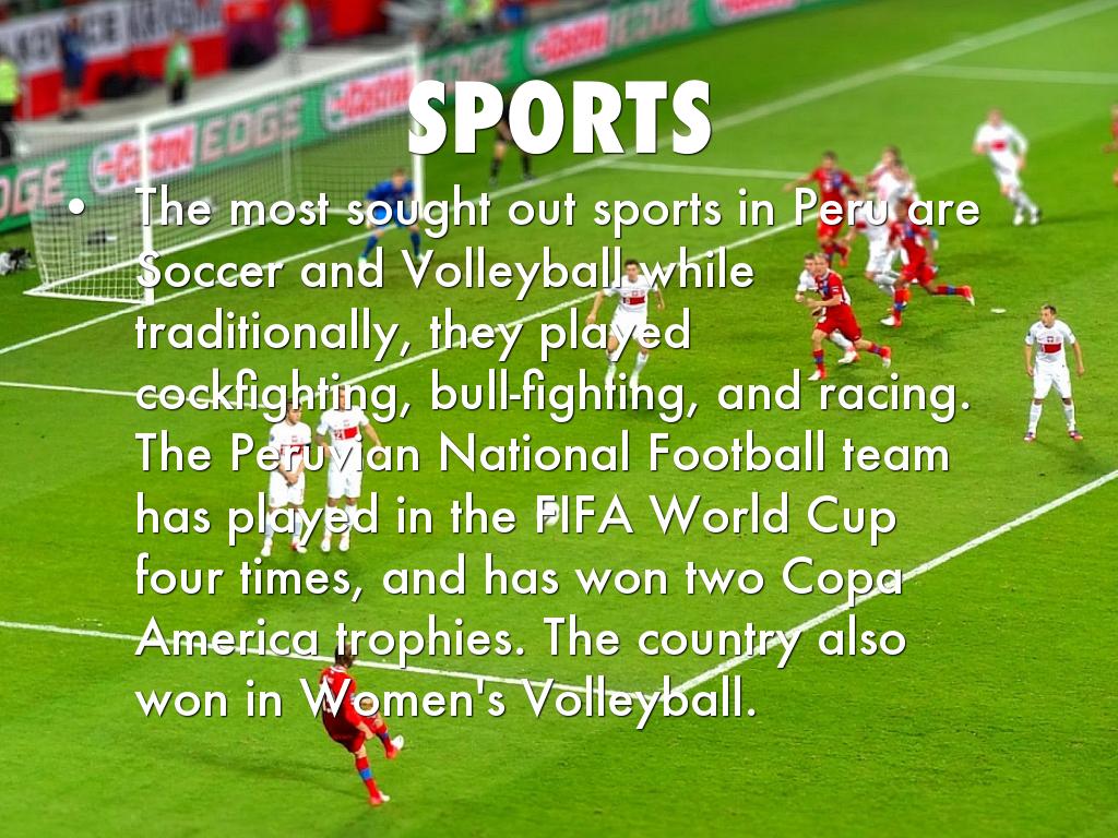 • The most sought out sports in Peru are Soccer and Volleyball while traditionally, they played cockfighting, bull-fighting, and racing. The Peruvian National Football team has played in the FIFA World Cup four times, and has won two Copa America trophies. The country also won in Women's Volleyball.