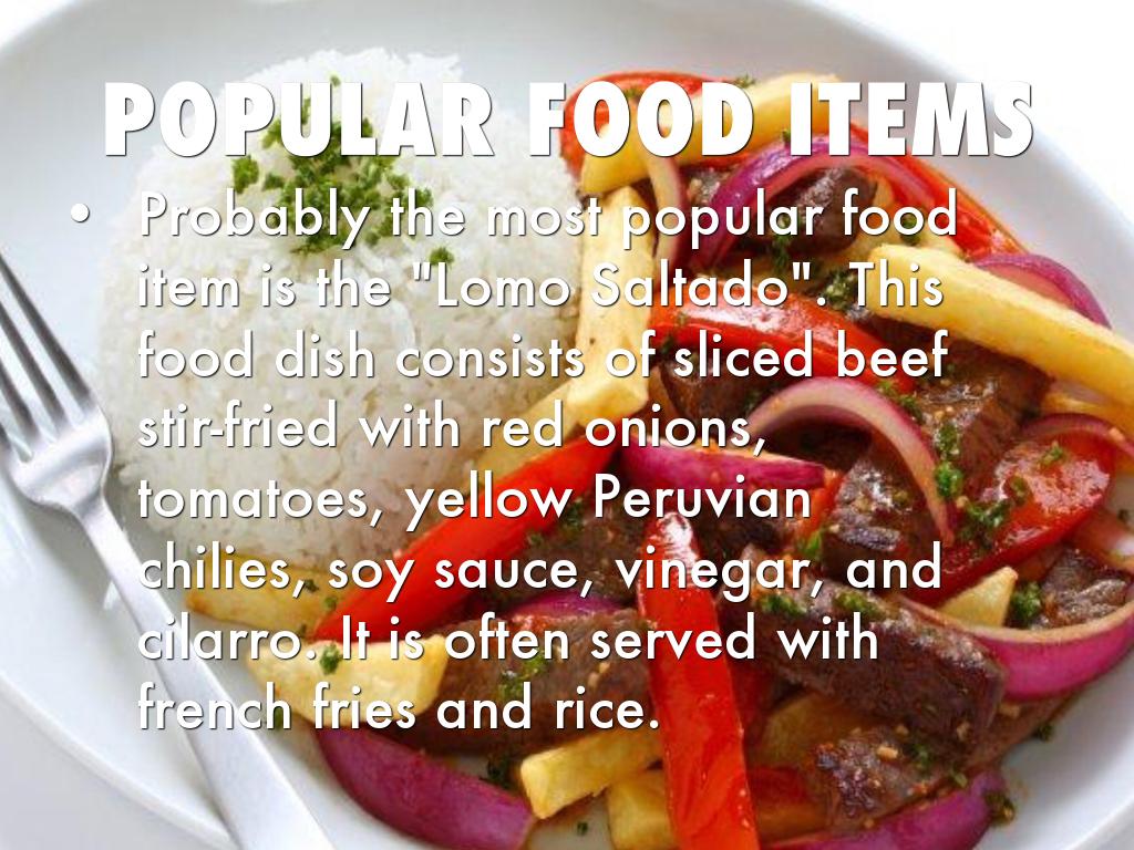 • Probably the most popular food item is the "Lomo Saltado". This food dish consists of sliced beef stir-fried with red onions, tomatoes, yellow Peruvian chilies, soy sauce, vinegar, and cilarro. It is often served with french fries and rice.