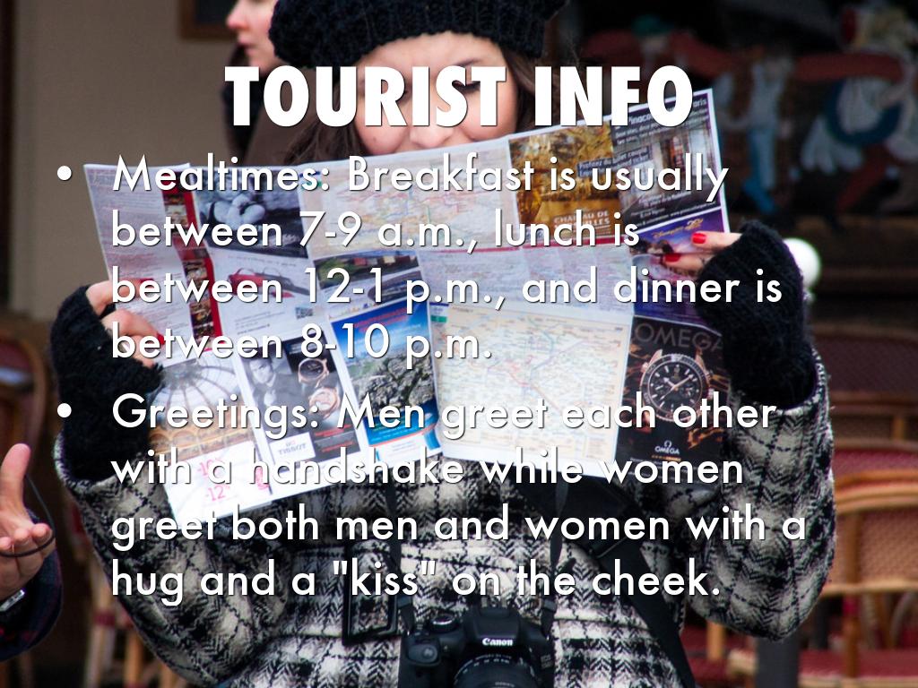• Greetings: Men greet each other with a handshake while women greet both men and women with a hug and a "kiss" on the cheek.