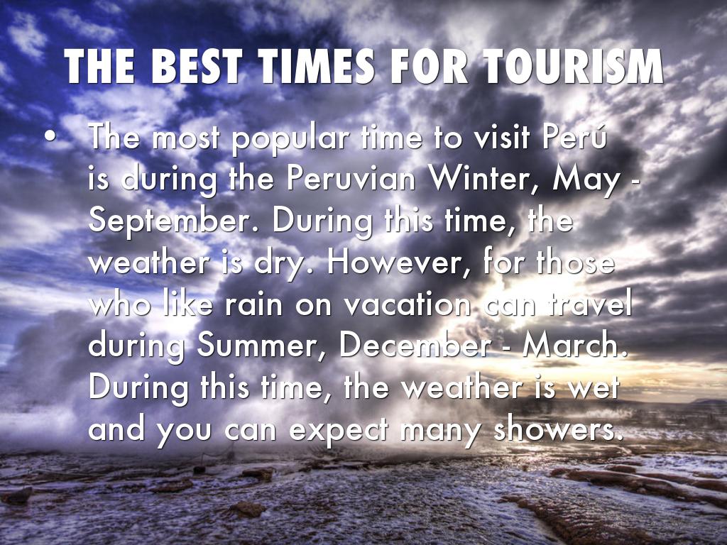 • The most popular time to visit Perú is during the Peruvian Winter, May - September. During this time, the weather is dry. However, for those who like rain on vacation can travel during Summer, December - March. During this time, the weather is wet and you can expect many showers.