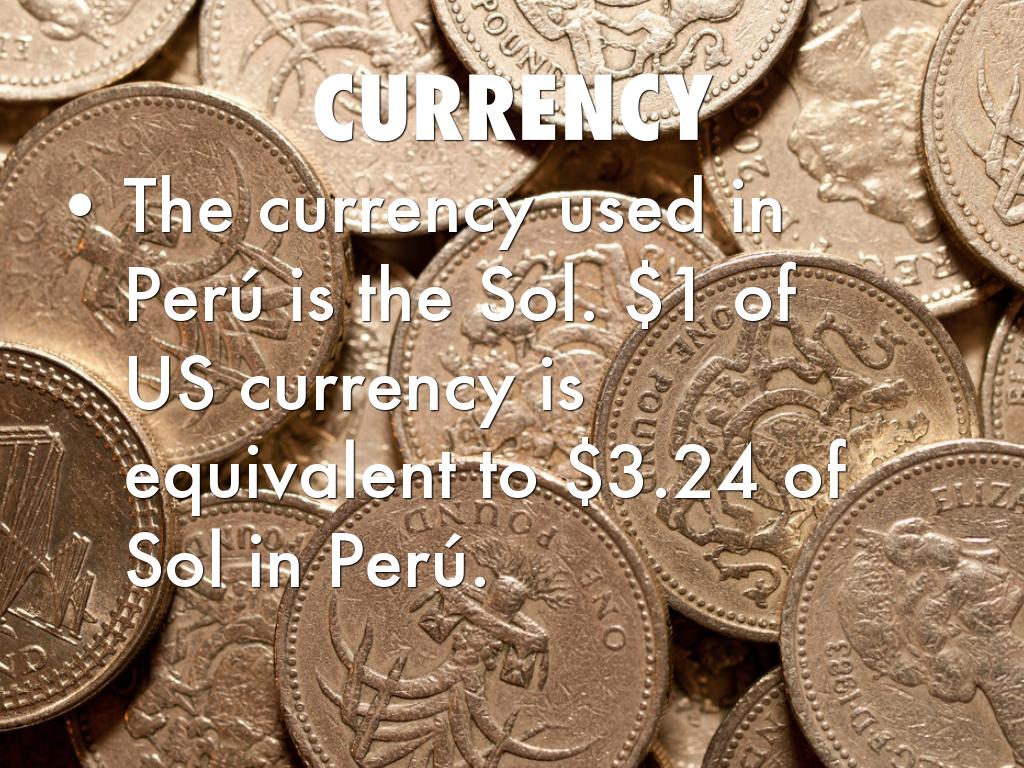 • The currency used in Perú is the Sol. $1 of US currency is equivalent to $3.24 of Sol in Perú.