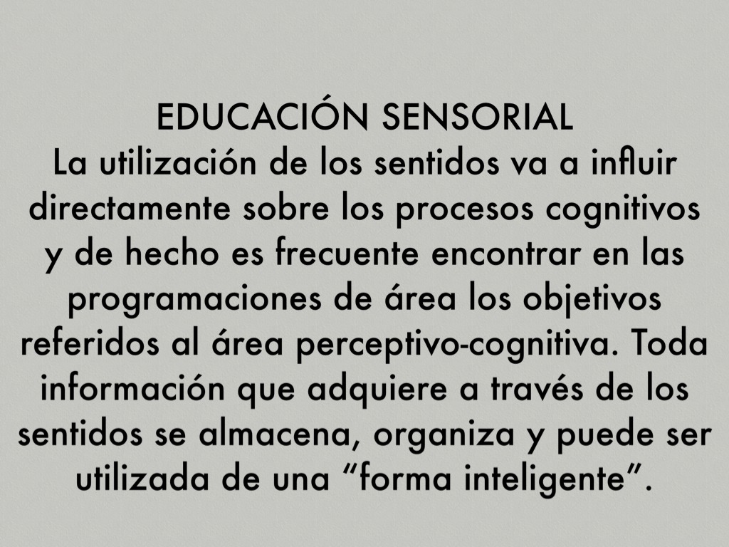 La utilización de los sentidos va a influir directamente sobre los procesos cognitivos y de hecho es frecuente encontrar en las programaciones de área los objetivos referidos al área perceptivo-cognitiva. Toda información que adquiere a través de los sentidos se almacena, organiza y puede ser utilizada de una “forma inteligente”.