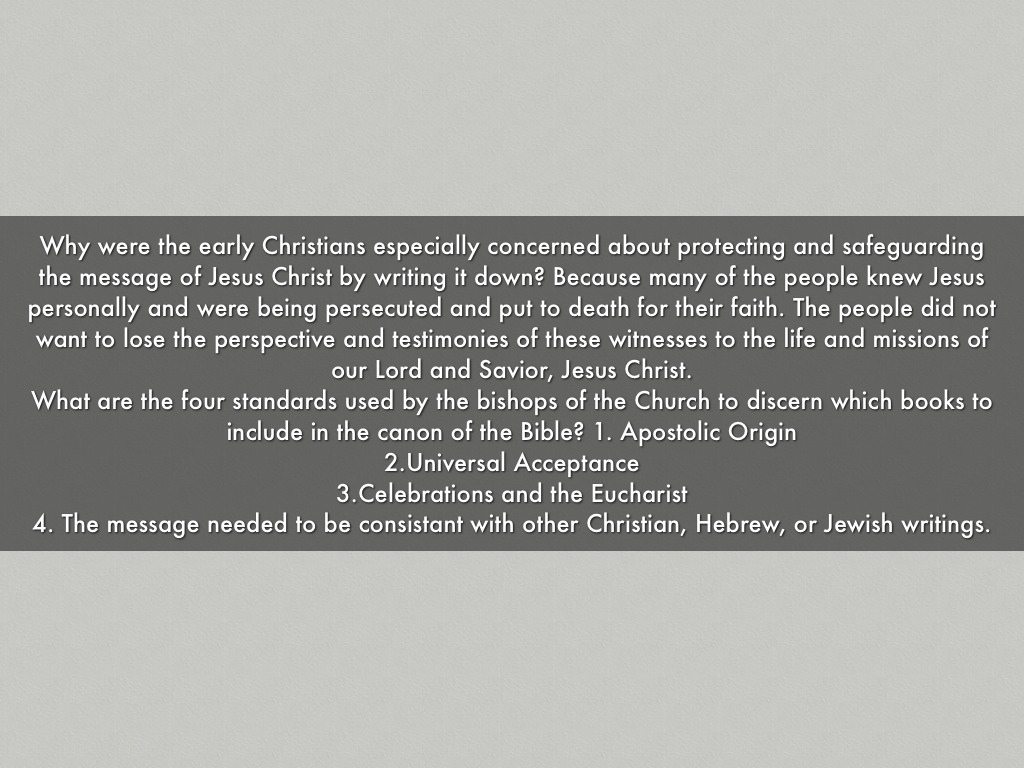 Why were the early Christians especially concerned about protecting and safeguarding the message of Jesus Christ by writing it down? Because many of the people knew Jesus personally and were being persecuted and put to death for their faith. The people did not want to lose the perspective and testimonies of these witnesses to the life and missions of our Lord and Savior, Jesus Christ.