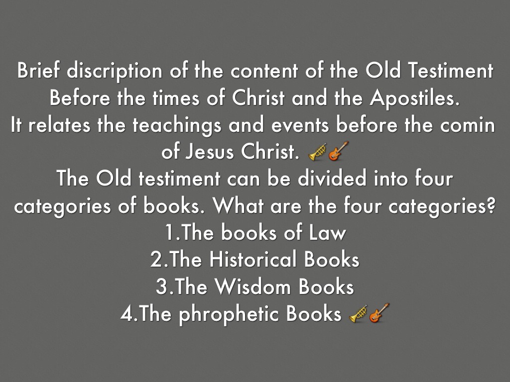 Brief discription of the content of the Old Testiment Before the times of Christ and the Apostiles.