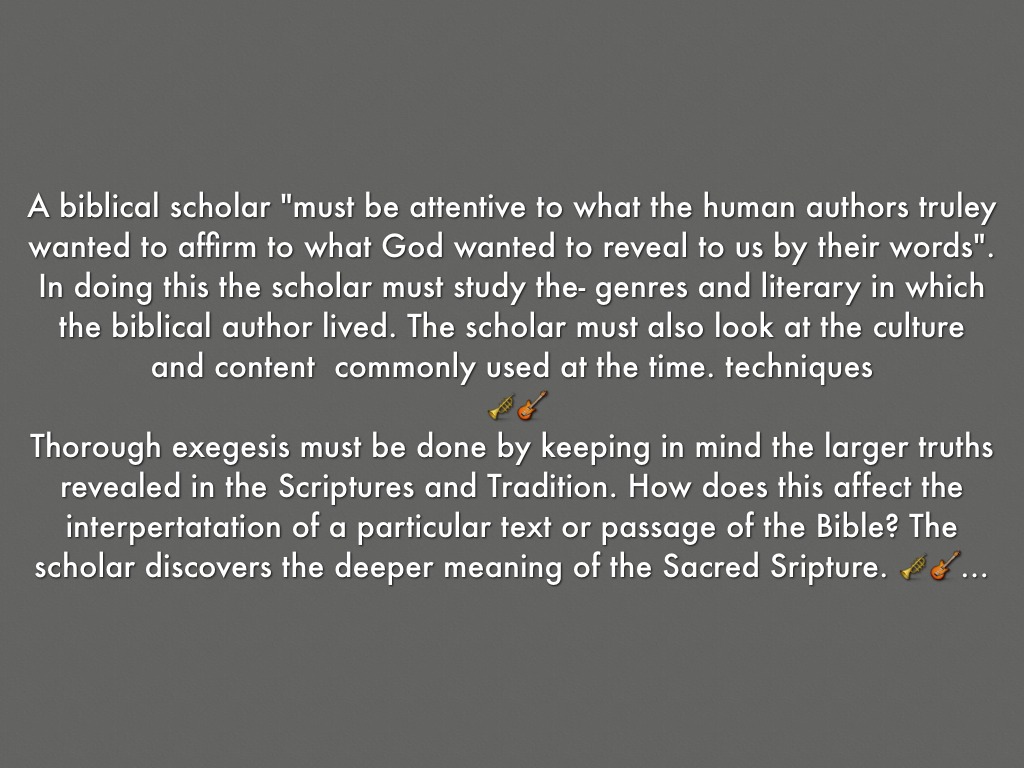 A biblical scholar "must be attentive to what the human authors truley wanted to affirm to what God wanted to reveal to us by their words". In doing this the scholar must study the- genres and literary in which the biblical author lived. The scholar must also look at the culture