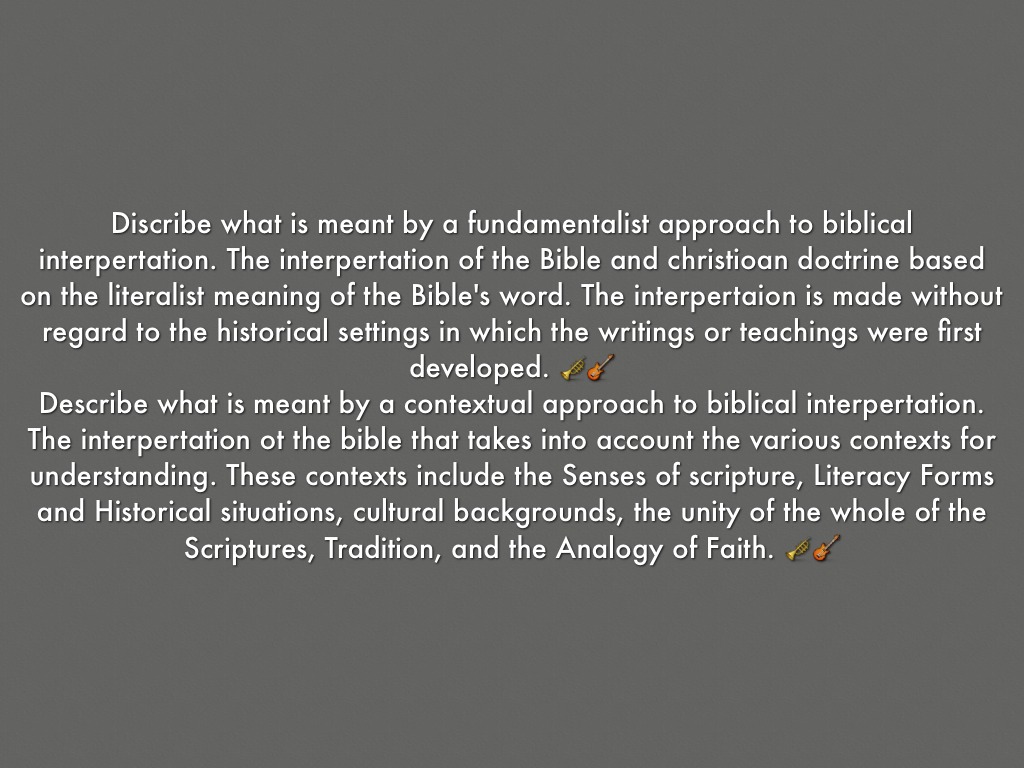 Discribe what is meant by a fundamentalist approach to biblical interpertation. The interpertation of the Bible and christioan doctrine based on the literalist meaning of the Bible's word. The interpertaion is made without regard to the historical settings in which the writings or teachings were first developed.