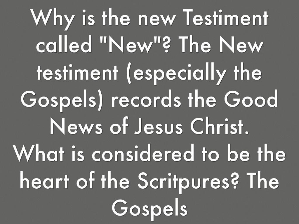 Why is the new Testiment called "New"? The New testiment (especially the Gospels) records the Good News of Jesus Christ.