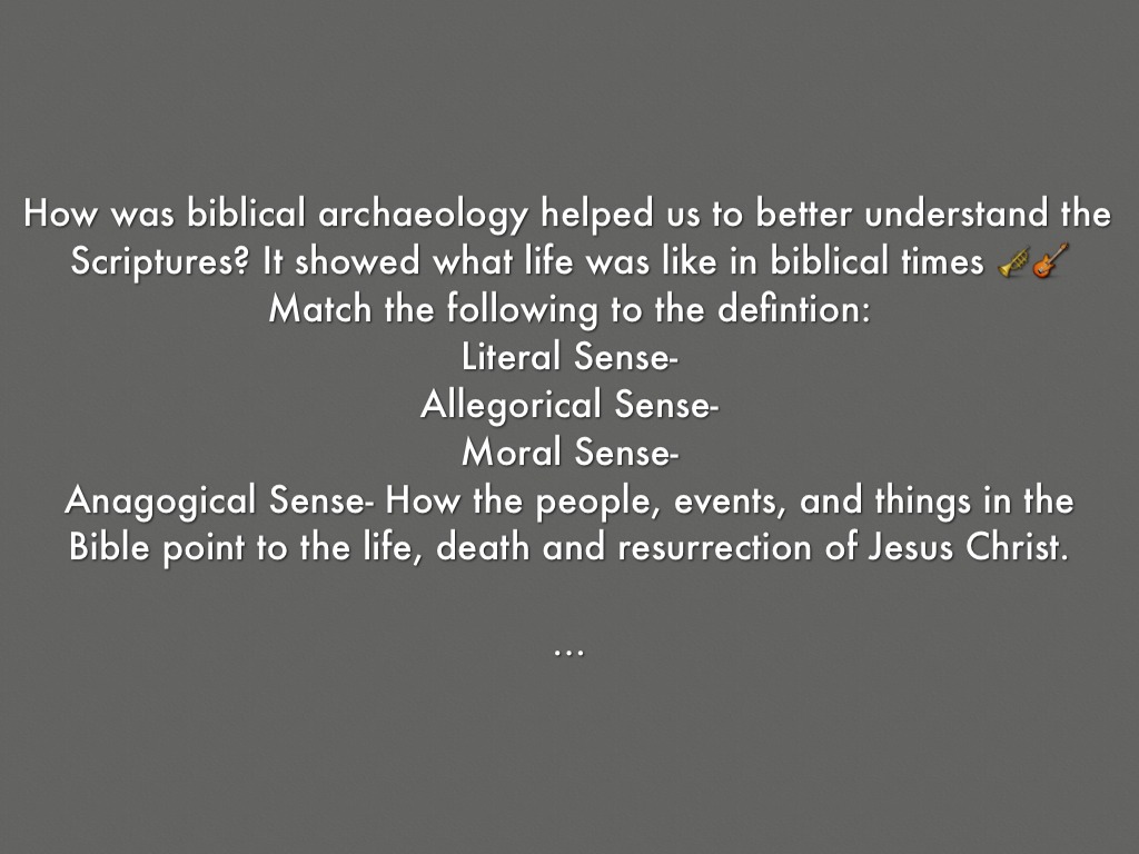 Anagogical Sense- How the people, events, and things in the Bible point to the life, death and resurrection of Jesus Christ.