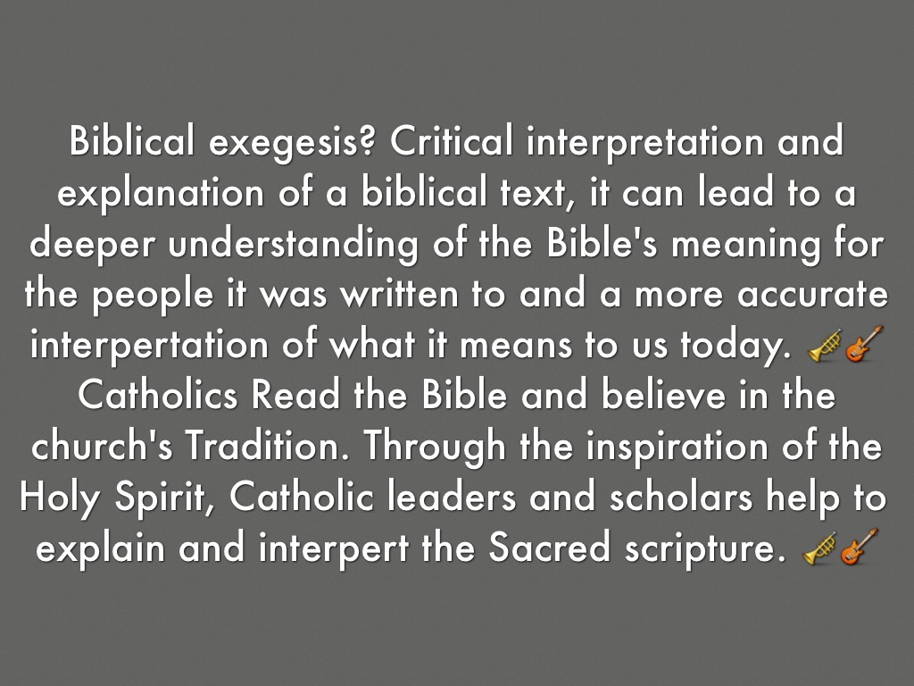 Biblical exegesis? Critical interpretation and explanation of a biblical text, it can lead to a deeper understanding of the Bible's meaning for the people it was written to and a more accurate interpertation of what it means to us today.