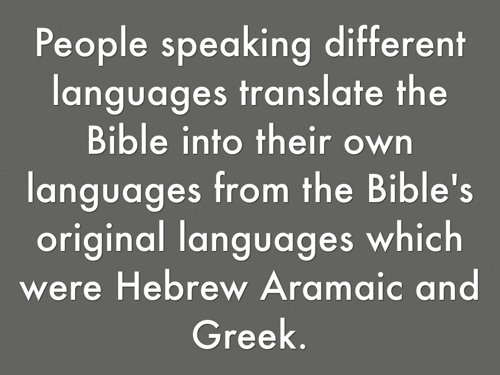 People speaking different languages translate the Bible into their own languages from the Bible's original languages which were Hebrew Aramaic and Greek.