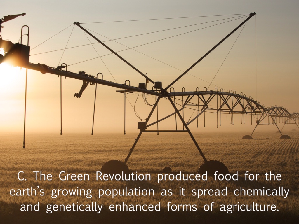 C. The Green Revolution produced food for the earth’s growing population as it spread chemically and genetically enhanced forms of agriculture.