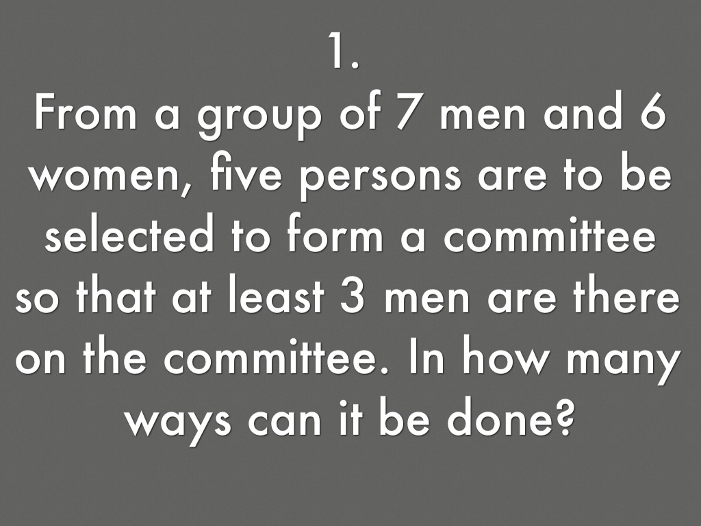 From a group of 7 men and 6 women, five persons are to be selected to form a committee so that at least 3 men are there on the committee. In how many ways can it be done?