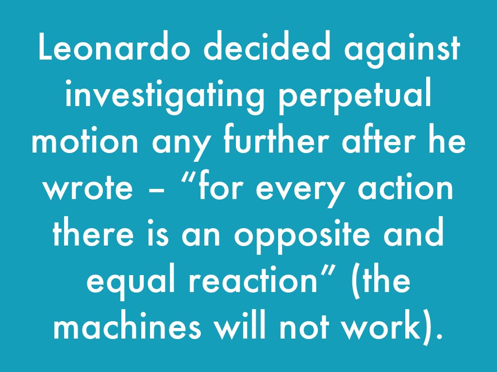 Leonardo decided against investigating perpetual motion any further after he wrote – “for every action there is an opposite and equal reaction” (the machines will not work).