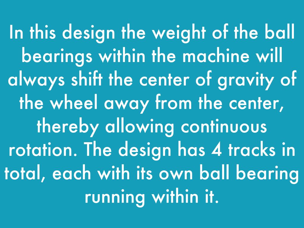 In this design the weight of the ball bearings within the machine will always shift the center of gravity of the wheel away from the center, thereby allowing continuous rotation. The design has 4 tracks in total, each with its own ball bearing running within it.