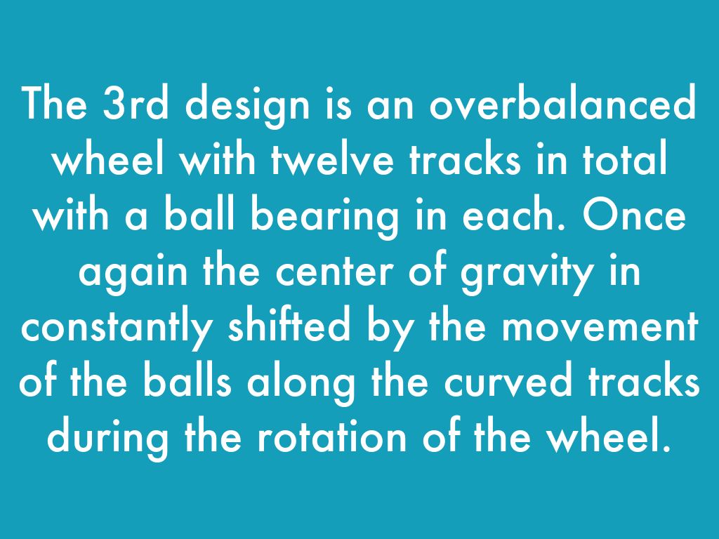 The 3rd design is an overbalanced wheel with twelve tracks in total with a ball bearing in each. Once again the center of gravity in constantly shifted by the movement of the balls along the curved tracks during the rotation of the wheel.