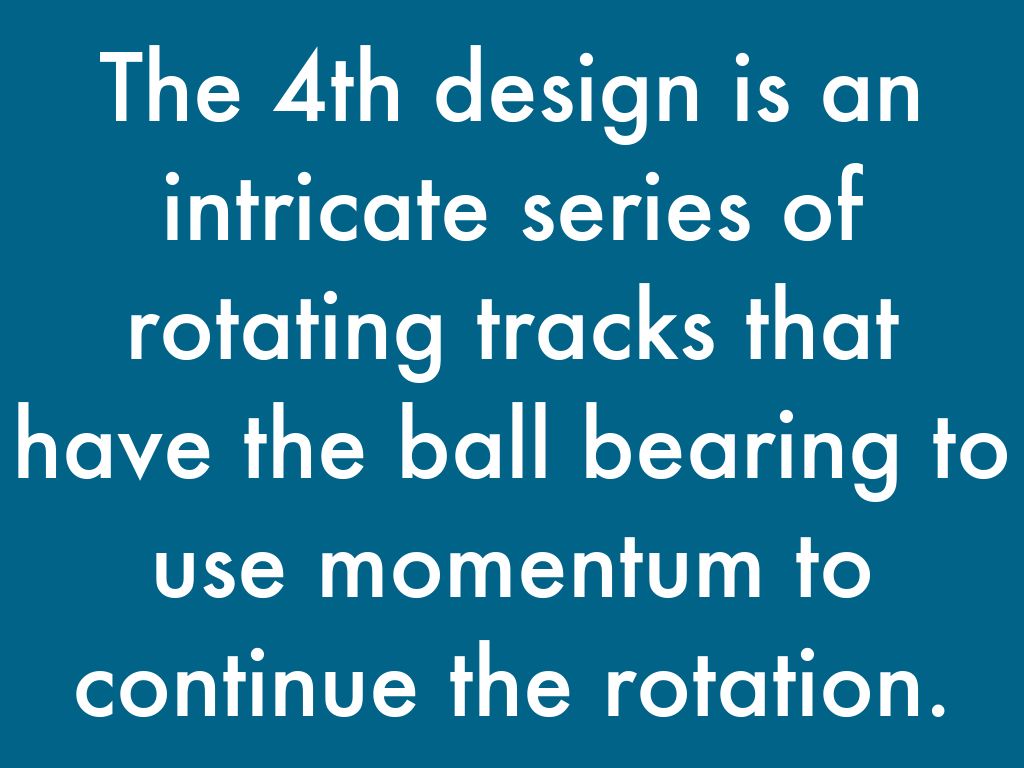 The 4th design is an intricate series of rotating tracks that have the ball bearing to use momentum to continue the rotation.